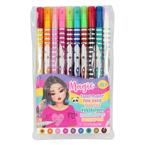 Skvělý set magických fixů značky Top Model. Devět oboustranných barevných fixů plus jeden magický. Maluj přes své kresby pomocí kouzelného fixu a barvy se změní. Fixy mohou být použity různými způsoby. Držíte-li jej kolmo, fix kreslí velmi jemné a přesné čáry. Ale pokud více šikmo, jeho linie jsou měkké a široké a jsou vhodné pro vyplnění velké oblasti. Tyto kouzelné fixy jsou skvělým dárkem pro každého malého malíře nebo malířku.Vhodné pro děti od 3 let.