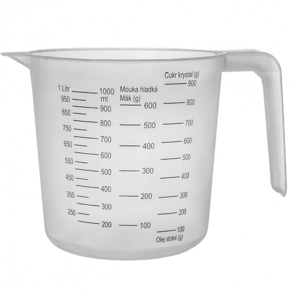 Tato plastová odměrka by neměla chybět v žádné kuchyni. Usnadní vám přípravu složitějších pokrmů a sladkých dezertů. Můžete v ní odměřit jak tekutiny, tak sypké potraviny, jako je mák, cukr, mouka nebo rýže – součástí jsou odměrné stupnice v gramech i mililitrech.