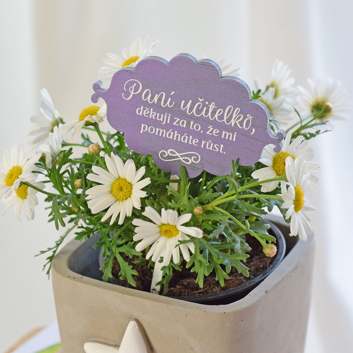 Dřevěný zápich s citátem pro paní učitelku. Pěkný doplněk k darované květině.  velikost: prečítať celé