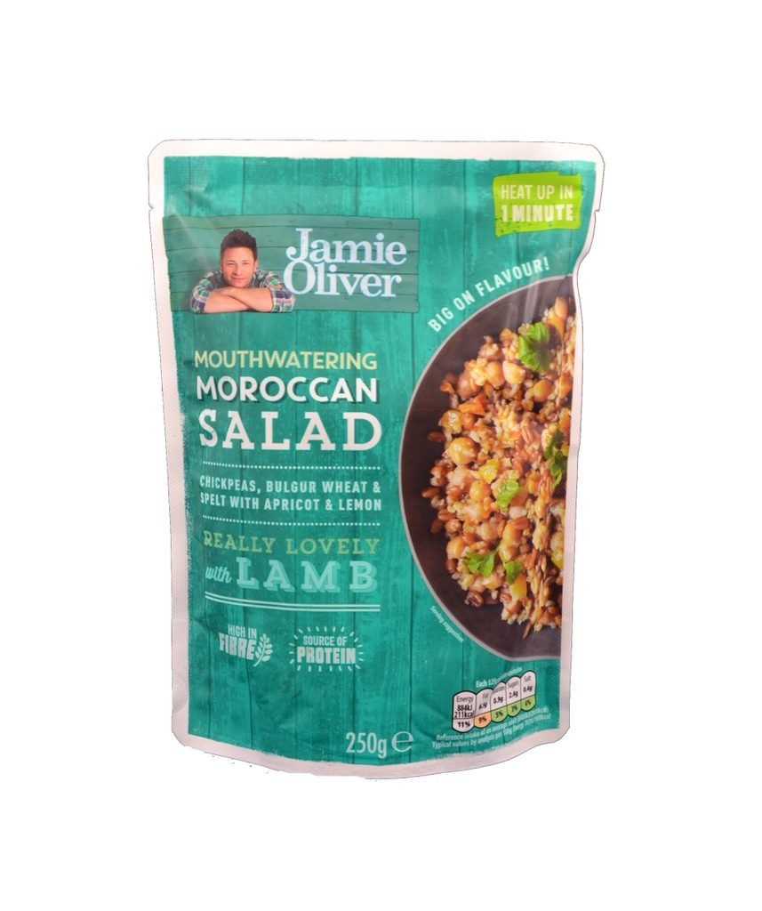 Marocký salát - Bulgur s meruňkou, citrónem & chilli. Složení: předvařený Bulgur 27% (voda, Bulgur (obsahuje lepek), předvařená špalda 27%, (voda, špalda, (obsahuje lepek), rehydratovaná cizrna, 27% (voda, cizrna), sušené kousky meruňek 5,2% (meruňky, konzervant: oxid siřičitý), extra panenský...