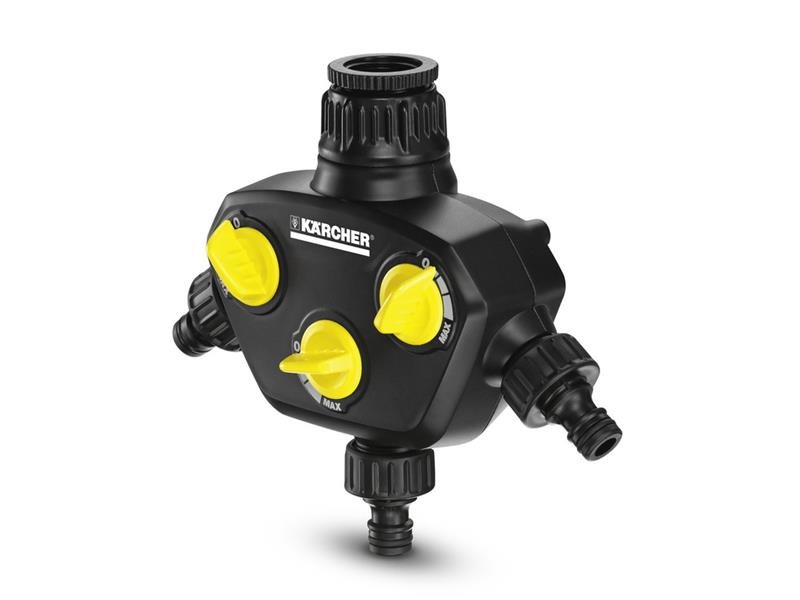 Vysoce kvalitní trojecestný rozdělovač Kärcher s kohoutovou přípojkou G1 a redukčním kusem G3/4 pro zavlažování až se třemi hadicemi současně. Trojcestný rozdělovač je vybaven třemi kohoutovými přípojkami se třemi nezávislými, plynulými regulátory a vyznačuje se optimalizovaným průtokem vody. Je univerzálně použitelný ve spojení se všemi běžnými zahradními hadicemi a přesvědčí Vás svou kvalitou, robustností a ergonomickým designem pro příjemnou a snadnou manipulaci. Převlečná matice s robustním vnitřním závitem zaručí jednoduché a pohodlné upevnění na vodovodním kohoutku. Trojcestný rozdělovač je kompatibilní s většinou dostupných připojovacích zacvakávacích systémů.