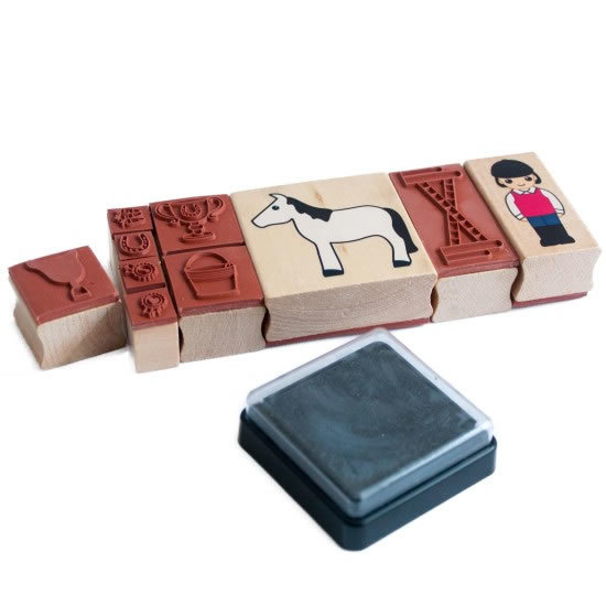 Sada 10 razítek s motivy koně, jezdce a dalších motivů ze stáje i z dostihů potěší především malé milovníky koní. Dítě si může vytvářet dle své fantazie obrázky dostihů i koní na pastvě či ve stáji. Otisky razítek může vymalovávat a dokreslovat pastelkami. 10 dřevěných razítek, inkoustový polštářek a 3 barevné pastelky jsou uloženy v praktickém plastovém pouzdru. Vhodné od 3 let.