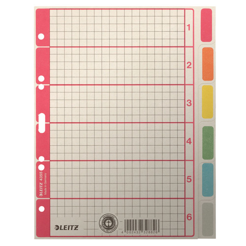 Kartonové rozlišovače značky Leitz. Formát A5 zpřehledňuje orientaci v kroužkových a pákových pořadačích.Set obsahuje 6 barevných dělících listů. prečítať celé