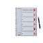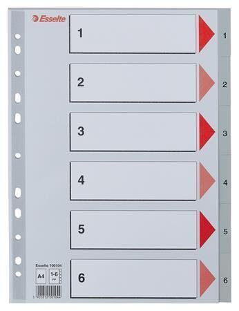 Rejstříky pro číselné roztřídění dokumentů v pořadačích či deskách do formátu A4 s popisovatelnou titulní stranou. Zesílená multiperforace plastovým proužkem na titulní straně. 6 dělicích listů se štítky 1-6 pro rychlou orientaci v obsahu. Univerzální multiperforace (11 děr) pro založení do...