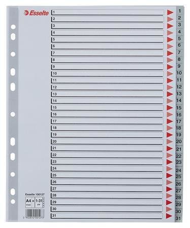 Barevné rejstříky, šedá, A4 Maxi, plast, 1-31, ESSELTE