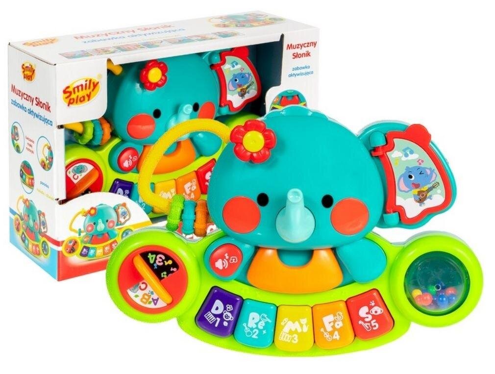 Zabawka aktywizująca muzyczny słonik pomaga rozwijać małą motorykę.
