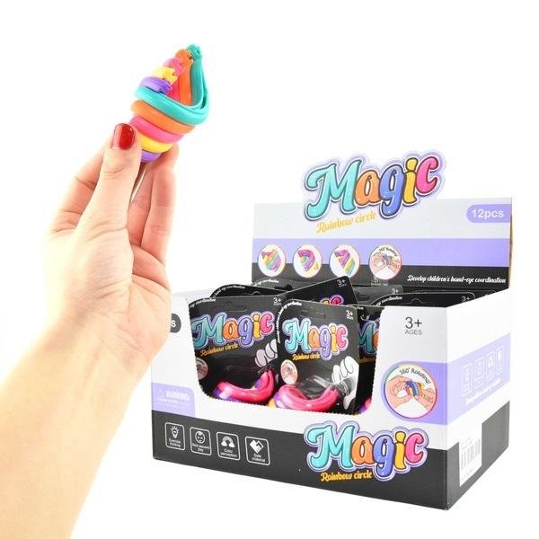 Zestaw składa się z 5 tęczowych, kolorowych pierścieni. Możemy je łączyć, obracać nimi w różne strony tworząc ciekawe kształty. Pierścienie są wykonane z przyjemnego w dotyku i bezpiecznego materiału. Nie posiadają ostrych krawędzi i wykończeń. Zestaw można rozłożyc na pojedyncze elementy. Zabawa...