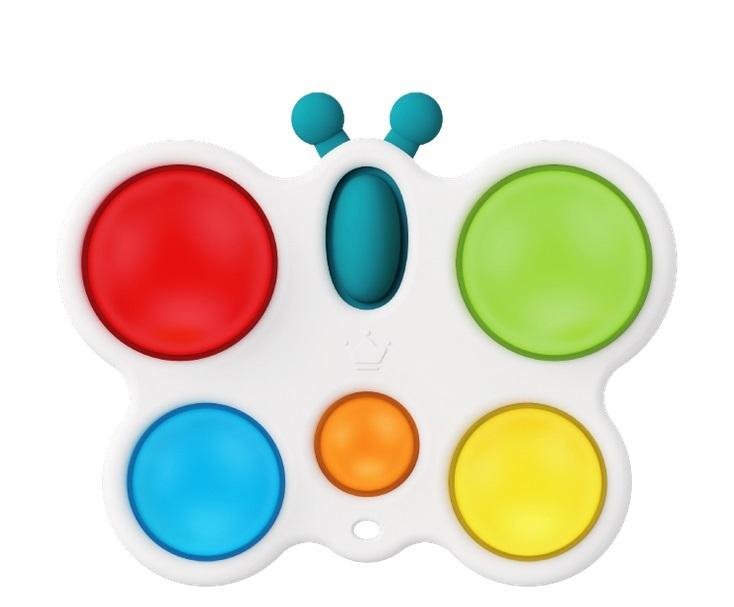 Wesoły motylek odpręży malucha zabawą w kolorowe klikanie! Ta zajmująca czynność stanowi świetną rozrywkę, która dodatkowo pomaga ćwiczyć paluszki. Motylek posiada jedno owalne i pięć okrągłych, kolorowych pól. Zadaniem najmłodszych jest przepchnąć wszystkie wypukłe elementy na drugą stronę...