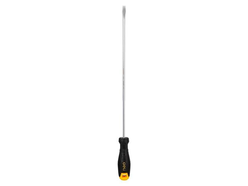 Praktický a odolný plochý šroubovák v černé barvě. Rukojeť výrobku je vyrobena z vysoce kvalitního plastu. Je v ní praktický otvor, který umožňuje zavěšení například na desku s nářadím. Šroubovák skvěle padne do ruky a jeho používání je mimořádně pohodlné.