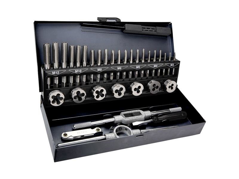 Sada obsahuje:Závitníky: 3x M3x0,5, 3x M4x0,7, 3x M5x0,8, 3x M6x1, 3x M8x1,25, 3x M10x1,5, 3x M12x1,75