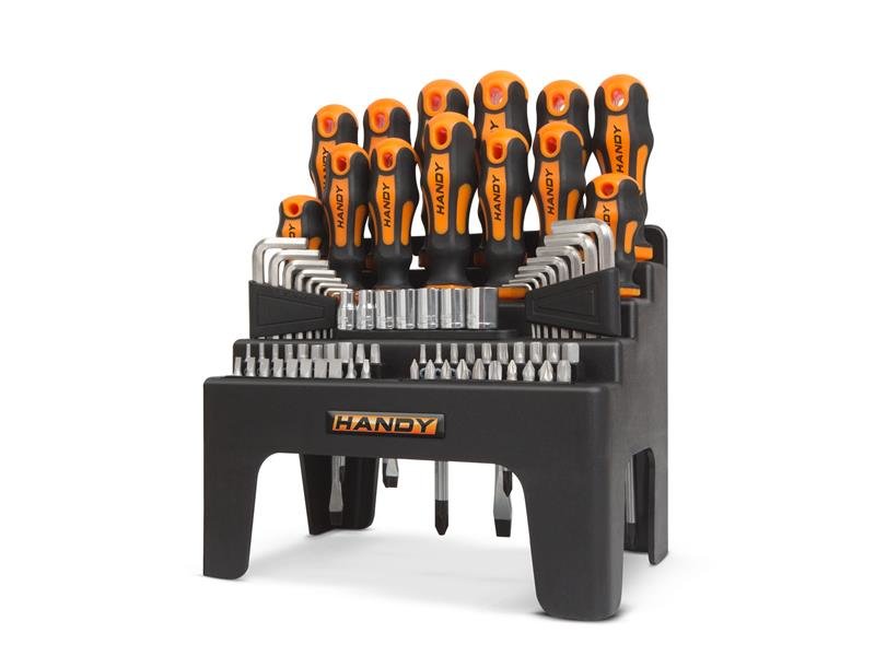 Velká sada šroubováků, která uspokojí téměř jakýkoliv montážní proces. Sada obsahuje 12 šroubováků, 40 bitových hlav, 7 hlaviček, 16 imbusových klíčů a také a podpůrný držák pro přehledné uložení nástrojů. dá se připevnit na zeď pomocí dvou otvorů pro háčky. Každý šroubovák má protiskluzovou, dvousložkovou ergonomickou rukojeť pro pohodlné a bezpečné použití. Ideální pro domácí kutily, kola, montáž automobilů a další montážní procesy.