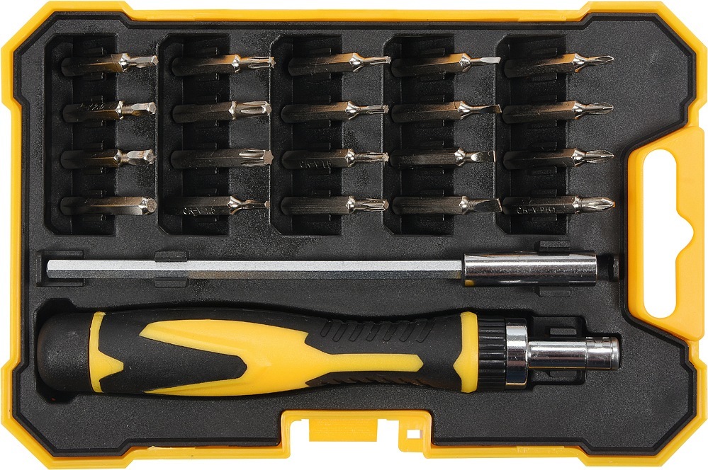 Praktická sada ráčnového šroubováku v sadě s bity. Nářadí je precizně zpracováno z CrV oceli a jednotlivé nástavce 5/32"(4 mm) jsou magnetické, čímž usnadňují práci se součástkami. Sada je uložena v praktickém pouzdře z odolného plastu. Obsah sady bit šroubovací plochý 1,5; 2; 2,5; 3 mm bit...