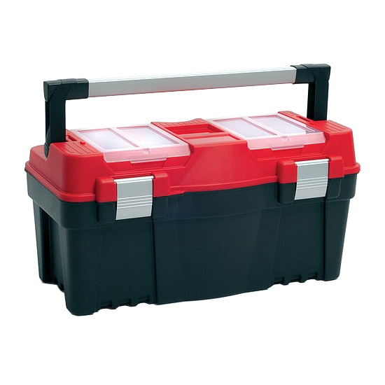 Ruční přenosný kufr na nářadí. Slouží k uskladnění různého nářadí a příslušenství, kleště, nůžky, pilníky, klíče, šroubováky atd. Tento Box na nářadí je vybaven kovovým držadlem a zámky, 2 plastovými pořadníky a odnímatelnou přihrádkou, pod kterou se nachází úložný prostor. Kufry řady APTOP jsou vhodné pro ty, kteří hledají kompromis mezi cenou a kvalitou. Je vyroben z odolného plastu v černé barvě s červeným víkem.