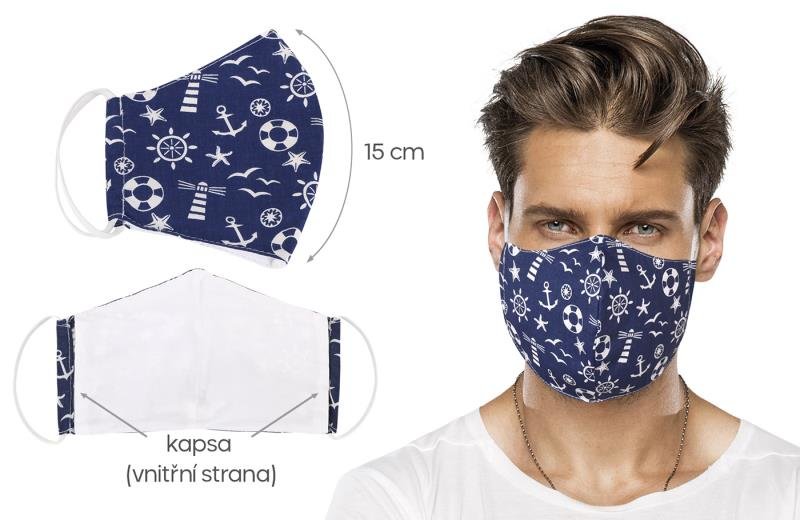 Ústní rouška bavlněná na gumičku s vnitřní kapsou - modrá kotva - délka oblouku 15cm