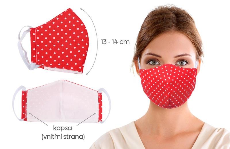 Ústní rouška dětská , dívčí bavlněná na gumičku s vnitřní kapsou - červený puntík - délka oblouku 13cm