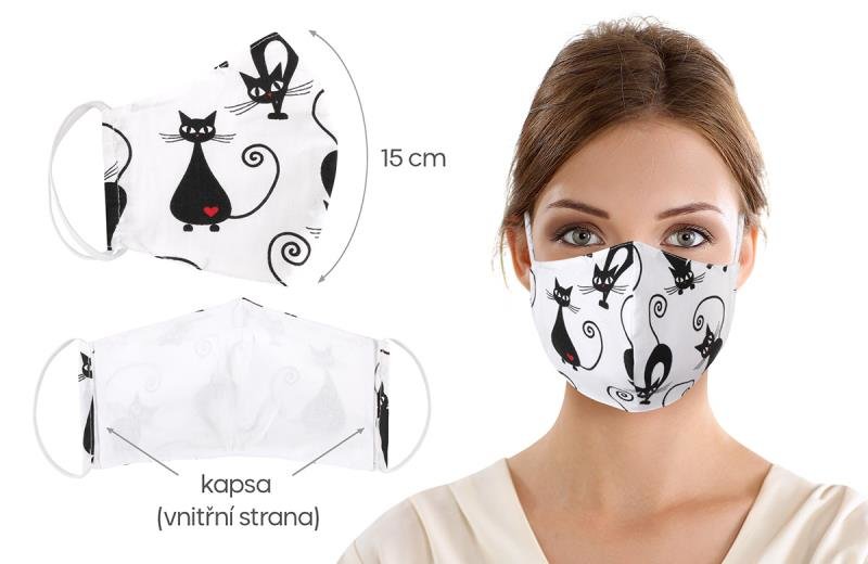 Ústní rouška bavlněná na gumičku s vnitřní kapsou - kočičky - délka oblouku 15cm
