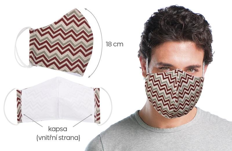 Ústní rouška bavlněná na gumičku s vnitřní kapsou - chevron vínový - délka oblouku 18cm