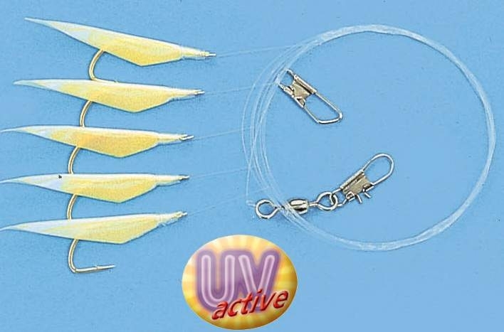 Systém veľ.č. 6 pre lov pilkrovaním na mori, s piatimi zlatými háčikmi s naviazanou fluorescenčnou žltou fóliou pre lov tresiek, makrel a rôznych iných morských rýb. Používaný najmä v Nórsku. UV aktívna farba. prečítať celé