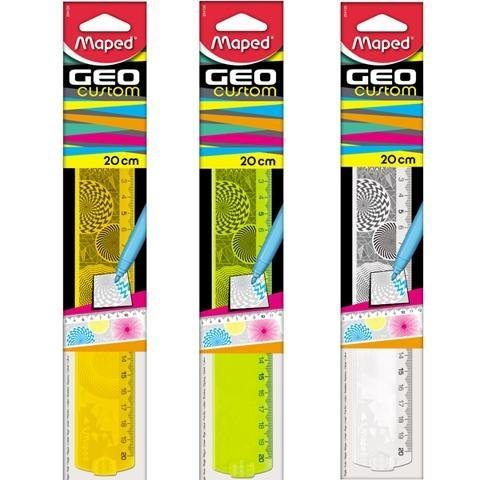Linijki GEOCUSTOM - innowacyjne linijki z wygrawerowanymi wzoramii geometrycznymi wykonanymi metodą laserową. Można je kolorować nadając tym samym niepowtarzalny charakter. Atrakcyjne kolory: pomarańczowy fluo, żółty fluo i przezroczysty. Pakowane w torebki zawieszkowe. Długość 20 cm. Kolor linijki wysyłany losowo.