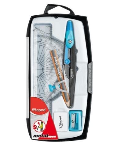 Zestaw geometryczny 8 elementowy. W skald zestawu wchodzą: cyrkiel uniwersalny, ołówek drewniany, temperówka, gumka, linijka 15 cm, 2 ekierki i kątomierz. Cyrkiel wykonany z czarnego metalu, gumowana część uchwytu poprawia komfort pracy, gumowy schowek na zapasowy grafit. Pakowane w plastikowe etui odporne na pęknięcia.