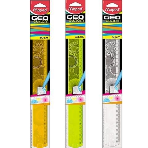 Linijki GEOCUSTOM - innowacyjne linijki z wygrawerowanymi wzoramii geometrycznymi wykonanymi metodą laserową. Można je kolorować nadając tym samym niepowtarzalny charakter. Atrakcyjne kolory: pomarańczowy fluo, żółty fluo i przezroczysty. Pakowane w torebki zawieszkowe. Długość 30 cm