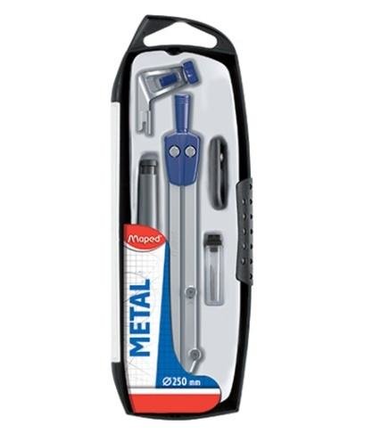 Klasyczny cyrkiel metalowy START z grafitem w zestawie piecioelementowym: cyrkiel na grafity, uniwersalny uchwyt na ołówek drewniany, ołówek automatyczny na grafity 0,5mm, zapasowy grafit 2mm, temperówka do grafitów. Maksymalny rozstaw ramion 250mm. Zestaw pakowany w etui.