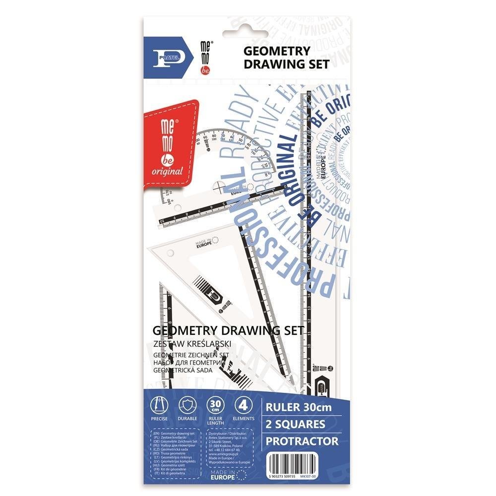 Czteroelementowy szkolny zestaw kreślarski. W każdym zestawie 2 standardowe przezroczyste ekierki 16 cm 45/60 stopni, kątomierz 10 cm/180 stopni oraz linijka 30 cm.Elementy zestawu posiadają trwałą nieścieralną podziałkę i zaokrąglone rogi dla bezpieczeństwa użytkownika. Precyzyjny nadruk skali (do 0,001 cm). Wykonane z plastiku o odpowiednim stosunku twardości do elastyczności zapewniającym wysoką odporność na złamania. Pakowane w woreczki z zawieszką.
