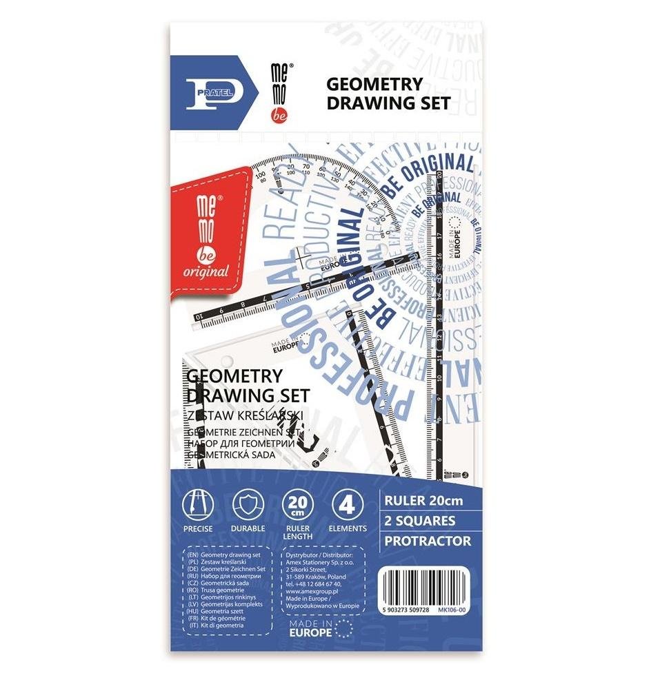 Czteroelementowy szkolny zestaw kreślarski. W każdym zestawie 2 standardowe przezroczyste ekierki 16 cm 45/60 stopni, kątomierz 10 cm/180 stopni oraz linijka 20 cm.Elementy zestawu posiadają trwałą nieścieralną podziałkę i zaokrąglone rogi dla bezpieczeństwa użytkownika. Precyzyjny nadruk skali (do 0,001 cm). Wykonane z plastiku o odpowiednim stosunku twardości do elastyczności zapewniającym wysoką odporność na złamania. Pakowane w woreczki z zawieszką.