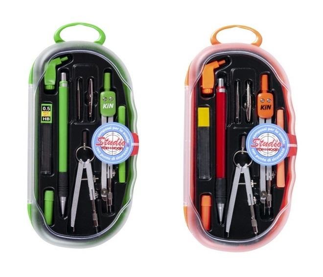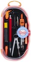 V balení nájdete dva typy kružidiel - jedno s dlhými a druhé s krátkymi ramenami a reguláciou, univerzálny držiak na ceruzku, grafit, držiak grafitu, automatickú ceruzku na náplne 0,5 mm, súpravu rysiek k ceruzke a tiež náhradnú rysku a špendlík. Všetko je uložené v praktickom plastovom boxe, ktorý uľahčuje skladovanie aj prenášanie.