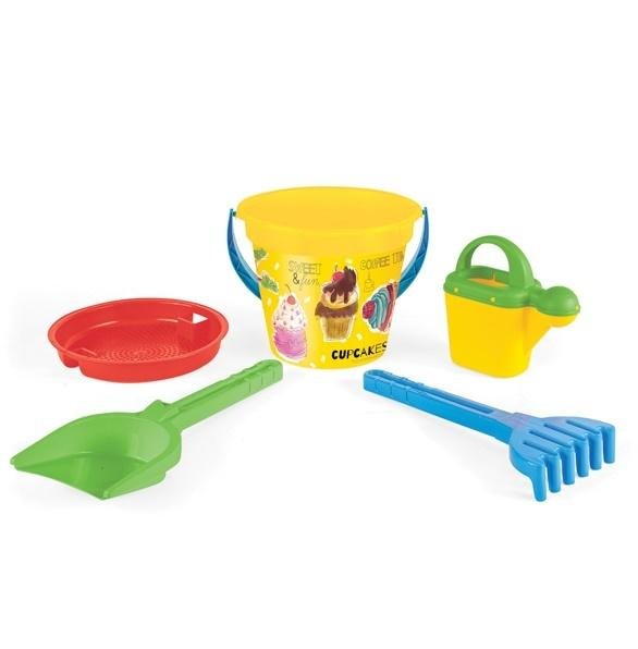 W skład zestawu wchodzą: okrągłe wiaderko, łopatka, grabki, sitko i młynek.