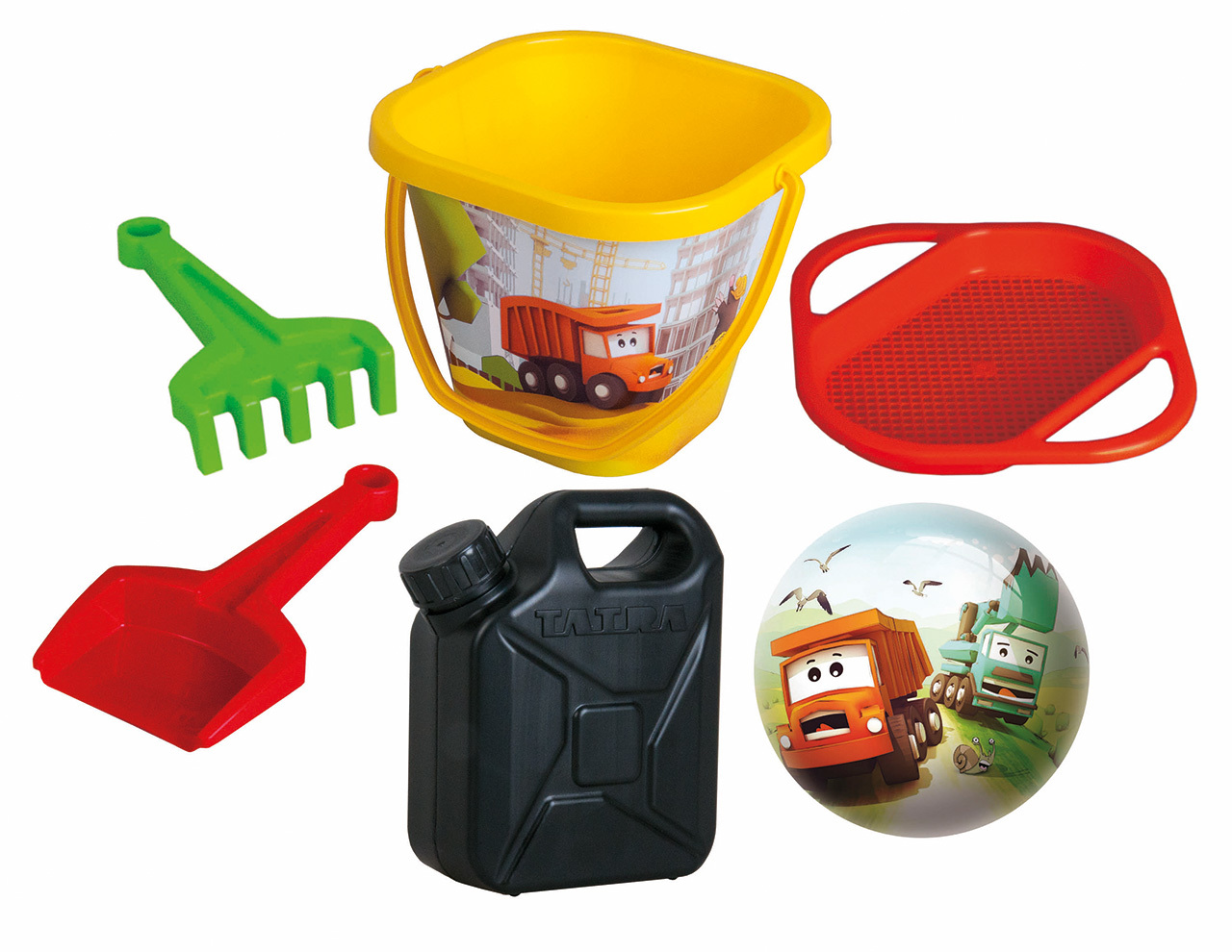 Sada obsahuje lopatku, hrabičky, kyblík, sítko, kanystr a míč 15 cm Tatra. prečítať celé