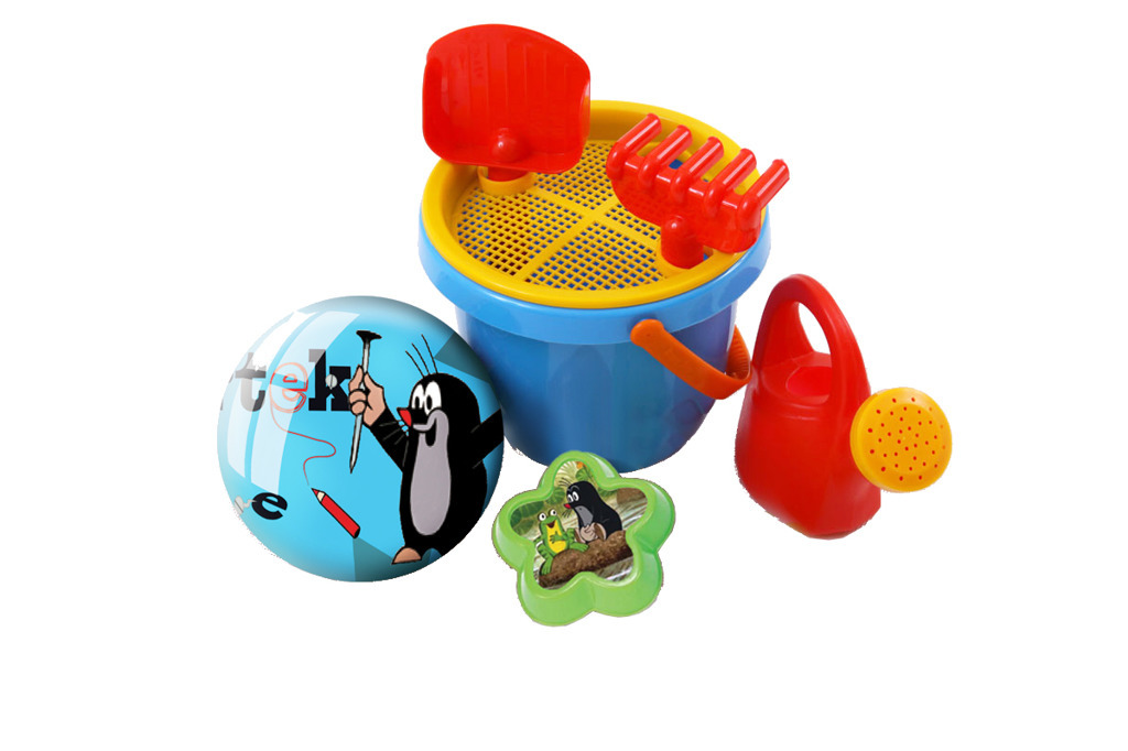 Plastový kyblík se síťkou + lopatka a hrabičky + 2 x různá formička s krtkem IML a konvička a míček 115 mm s vyobrazením Krtečka prečítať celé
