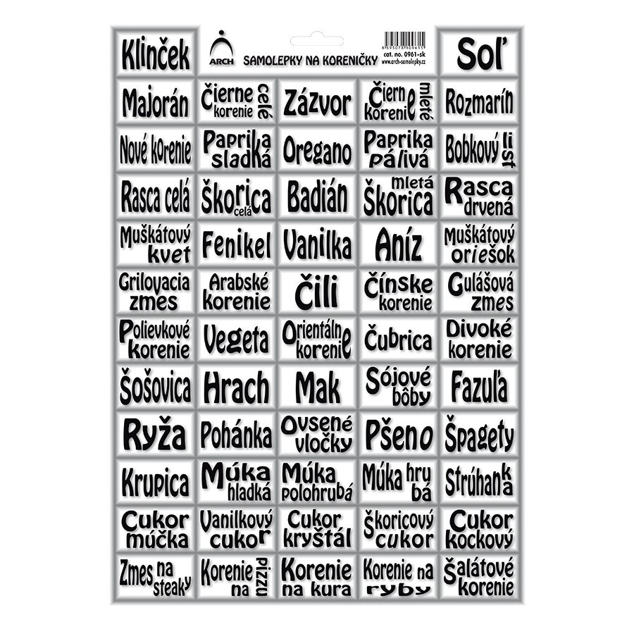 Máte rádi pořádek mezi pepřenkami?Nálepky na pepřenky Vám s tím pomohou. Na ,,archu" se nachází 57 nálepek s potiskem různých koření. Např. hladká mouka, polohrubá, majoránka, atp. prečítať celé