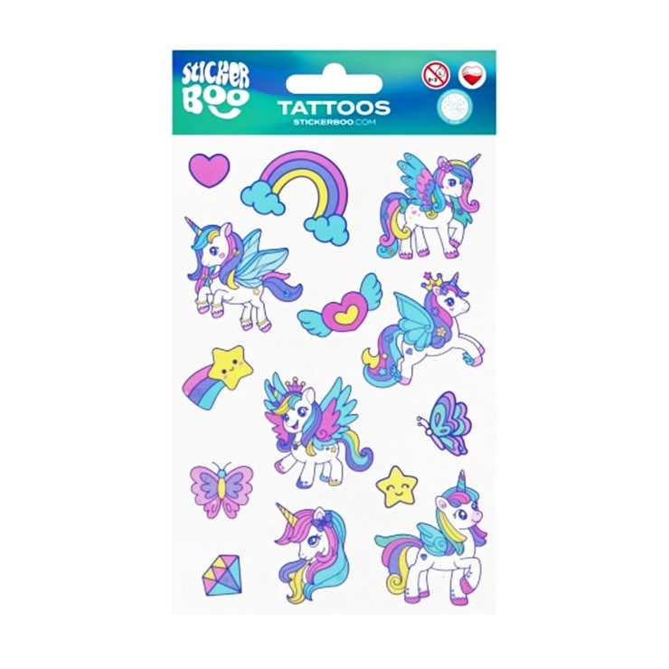 Tetování jednorožec, list se 14 tetováními. Rozměry produktu jsou 18x10 cm. Vhodné pro děti 3+. prečítať celé