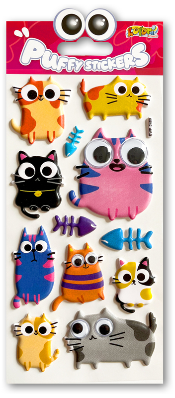 Wypukłe naklejki z serii Puffy stickers Google Eyes o zróżnicowanej ilości sztuk na arkuszu, postacie zmają charakterystyczne, wyłupiaste oczy. Do zdobień na kartkach okolicznościowych, pocztówkach, pudełkach na prezenty, torbach prezentowych, do dekoracji domu. Łatwo usuwalne . Format 9x20,5 cm.