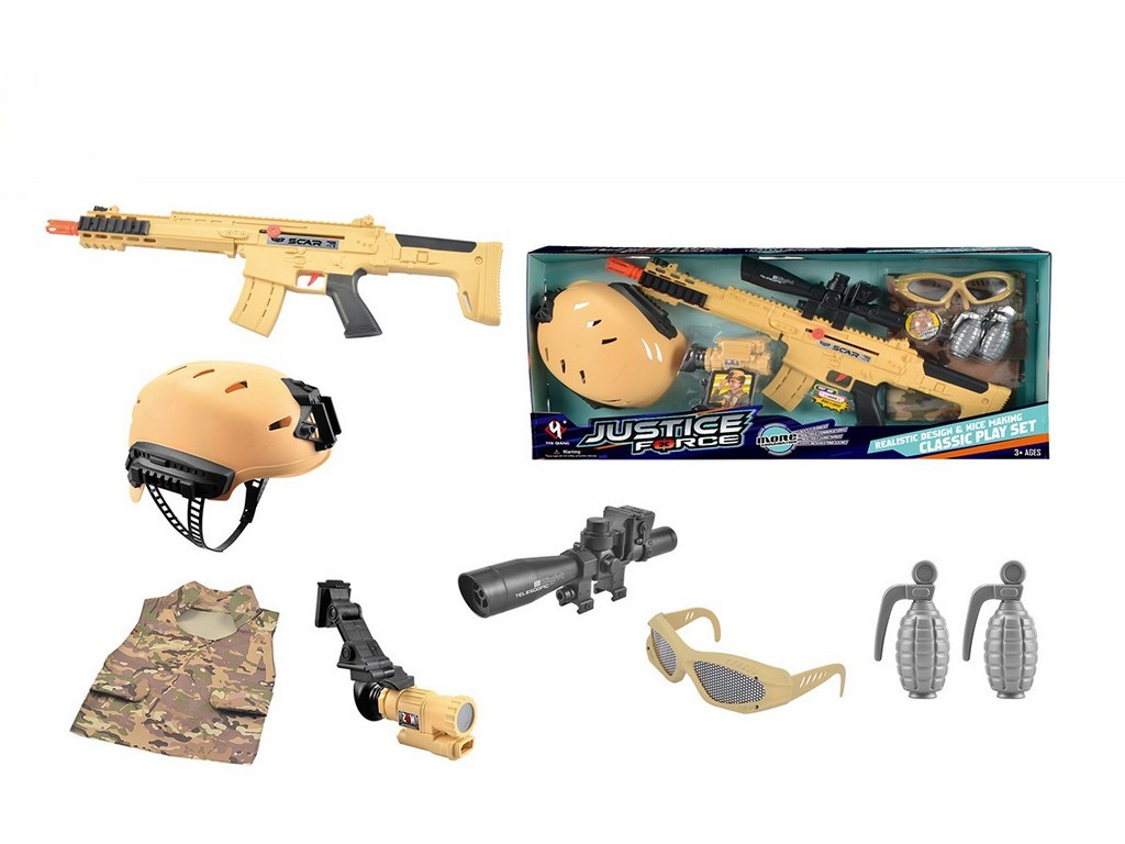 Nezbytná souprava pro malého ochránce zákona. Sada obsahuje maketu samopalu s možností přidání optického zaměřovače, kameru pro noční vidění, maskáčovou vestu, přilbu, ochranné brýle a dva granáty. Pozor přilba a brýle jsou hračka, neslouží jako ochranná pomůcka. Rozměr boxu: 72 x 32 x 8 cm. Vhodné pro děti od 3 let.