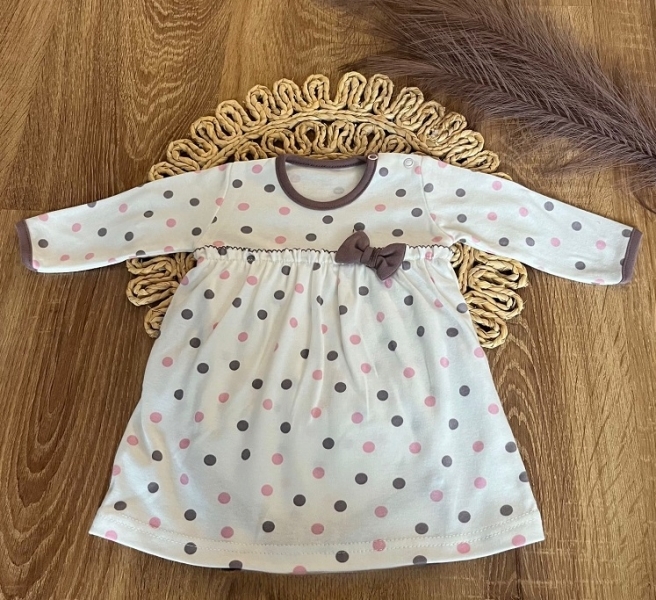 Bavlněné šaty s mašličkou, dl. rukáv, Puntík, Mamatti, smetanové s potiskem, vel. 86; 86 (12-18m)