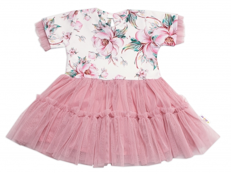 Šaty s tylovou sukni kr. rukáv, Růžičky Baby Nellys, pudrové, vel. 116/122