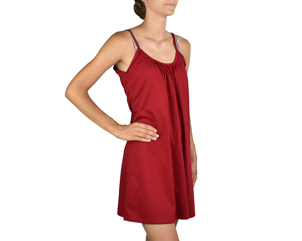Krátké dámské šaty ve volném „A“ střihu s tenkými nastavitelnými ramínky. Jemné řasení u výstřihu dodává ženskost, zatímco výrazný U výstřih na zádech působí elegantně a vzdušně. Díky příjemné bavlně jsou to ideální šaty do horkých letních dnů nebo jako delší top k legínám.Modelka je vysoká 180...