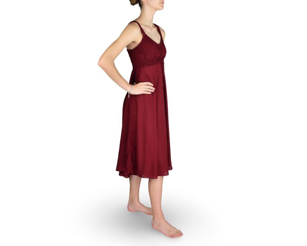 Lehké šaty s efektním háčkovaným živůtkem, elastickými ramínky a žabičkováním na zádech, áčkovou sukní.