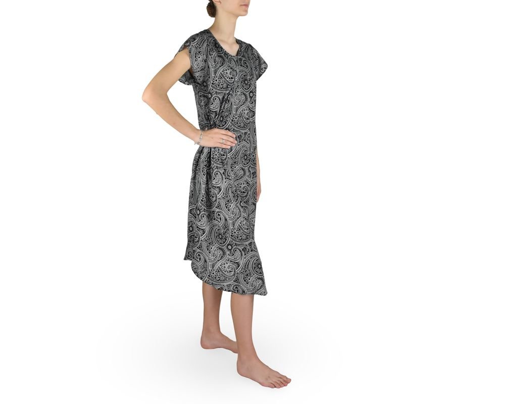 Dlouhé letní šaty s jedinečnými vzory. Šaty mají krátký rukáv a jsou stiženy do volného "A" střihu. Rozměry: délka: 110 cm, šířka přes prsa: 49 cm, délka průramku: 25 cm, pas: 64 cm.Materiál: 100% viskózaTextil, který nosíte, položte volně na stůl či jinou rovnou plochu. Změřte v místech dle...