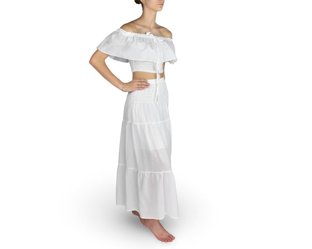 Lehký bavlněný set sukně a topu. Sukně áčkového střihu s širokým žabičkovaným pasem, se spodničkou. Top s žabičkováním, volánem a vazačkou
