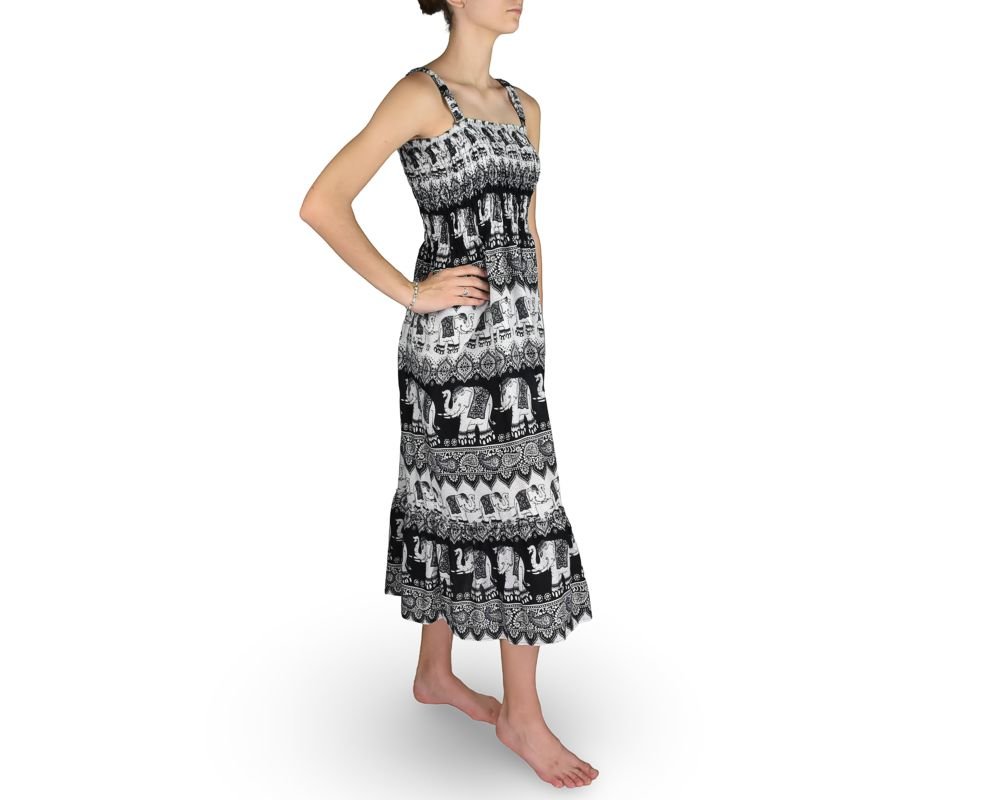 Dlouhé letní šaty s tenkými ramínky, žabičkovaným živůtkem a sukní zdobenou volánem.Přibližné rozměry: délka od podpaži: 115 cmšířka v pase: cca 65 cmšířka přes boky cca: 75 cmDíky žabičkování na hrudníku sedí velikostem S-L.Textil, který nosíte, položte volně na stůl či jinou rovnou plochu....