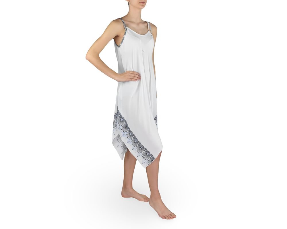 Středně dlouhé volné šaty s tenkými posuvnými ramínky. Ideální do horkého letního počasí. Spodní část šatů je střižena do delších cípů.Materiál: 100% viskóza Rozměry: Kratší délka: 55 cm Delší délka: 106 cmŠířka přes prsa: 51 cm Velikost max. LTextil, který nosíte, položte volně na stůl či jinou...