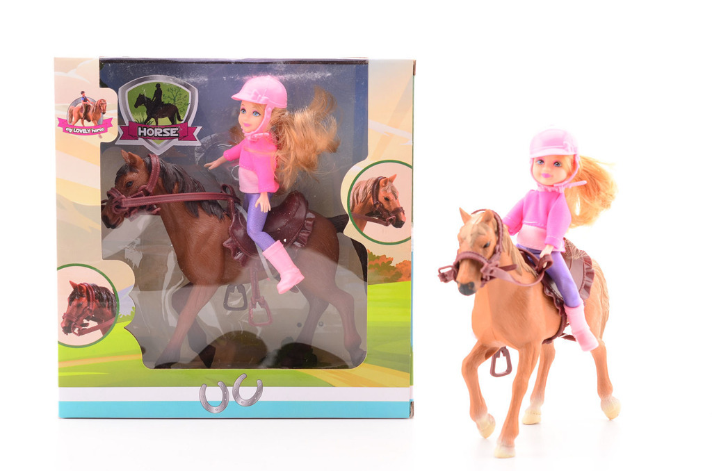 Koníček s panenkou jezdkyní. Dva druhy koníků – světle nebo tmavě hnědý. Balení obsahuje panenku s vlásky v jezdeckém oblečení, postroj na koně, sedlo a koníka. Velikost panenky s koníkem 23 cm. prečítať celé