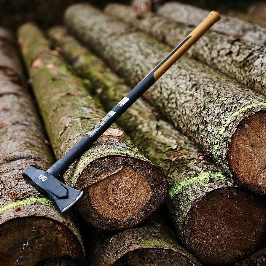 Sekera s protiskluzovým, ergonomicky tvarovaným topůrkem, čepelí z kalené oceli tvrzené uhlíkem, integrovaný chránič topůrka při špatném úderu.