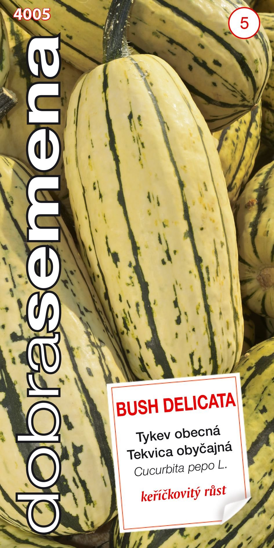 Cucurbita sp. L. / TekvicaPopis: BUSH DELICATA – poloplazivá rostlina s kratšími výhony. Plody jsou podlouhlé, smetanově bílé, s podélnými zelenými pruhy. Dosahují hmotnosti kolem 0, 5 kg a jsou oblíbené na pečení a plnění. Během léta můžete průběžně sklízet mladé plody. Plně vyzrálé plody,...