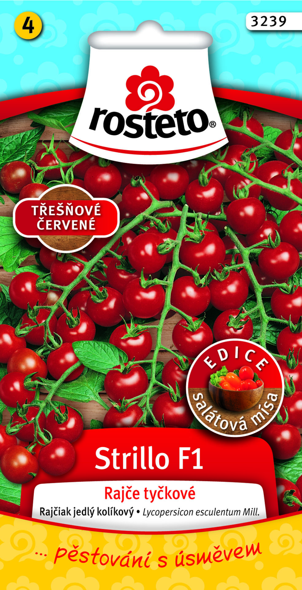 Lycopersicon esculentum Mill. / Rajčiak kolíkový Popis:Tyčkové třešňové rajče s plody o hmotnosti kolem 15 gramů. Plody jsou pevné a odolné k praskání, i navzdory tomu ale velice chutné a sladké. Výnosný hybrid s dlouhými hrozny nesoucími 15 - 18 plodů. Rajče vhodné pro fóliovníky i polní...