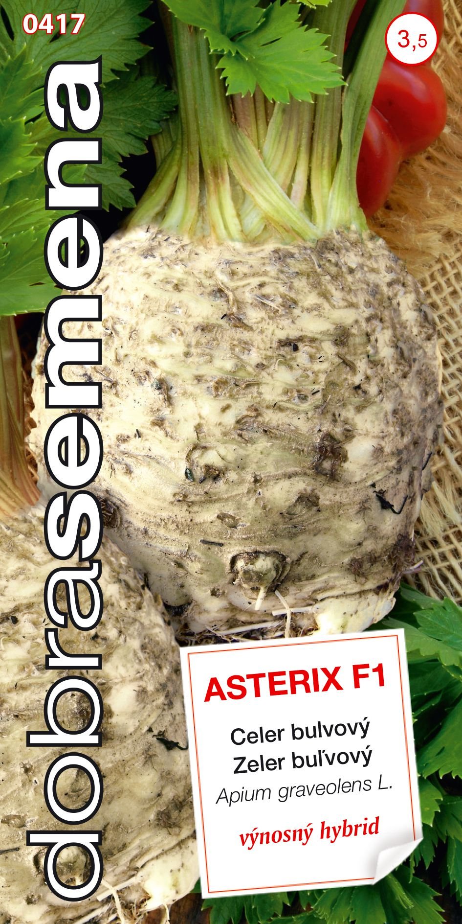 Apium graveolens / Zeler voňavý Popis: ASTERIX F1 - raná, vysoce výnosná hybridní odrůda bulvového celeru. Je určená pro sklizeň s natí nebo pro podzimní sklizeň ke skladování. Bulva je velmi velká, kulatá, kořenový systém vyrůstá pouze ze spodní části bulvy. Hybrid je odolný proti vybíhání do...