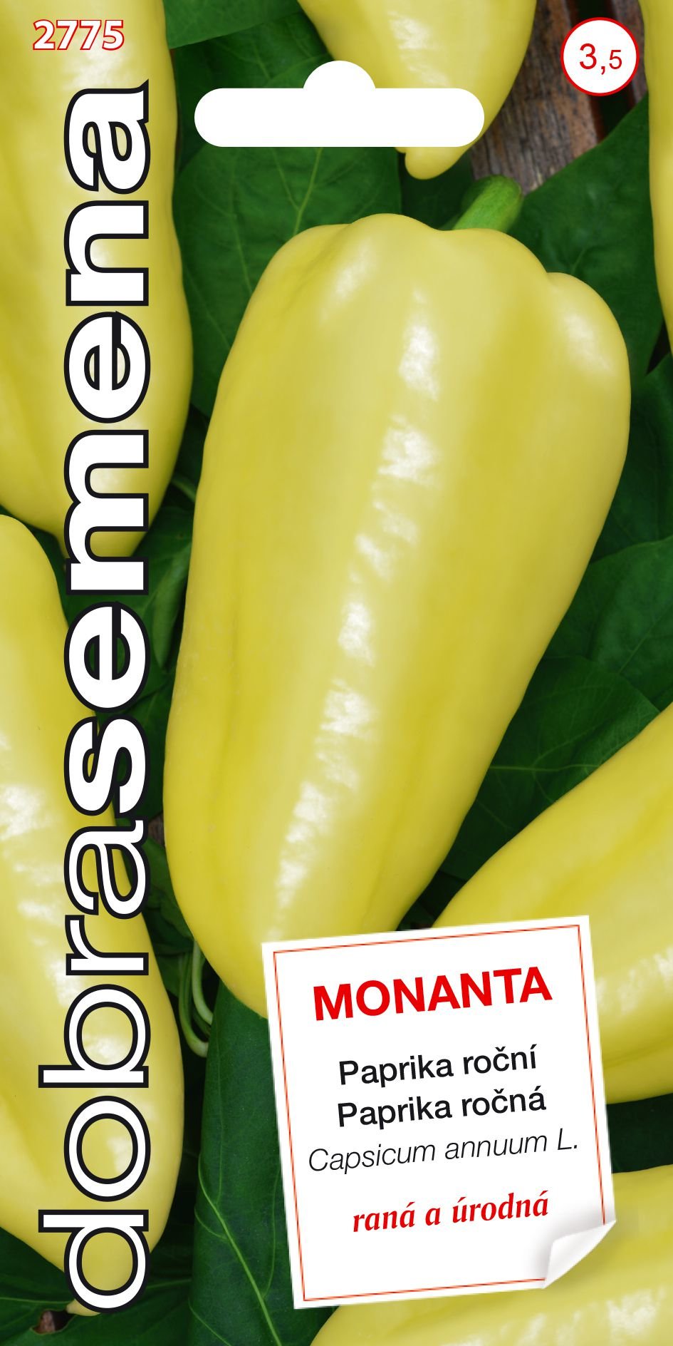 Capsicum annuum L. / Paprika ročnáPopis:MONANTA - velmi raná paprika vhodná pro polní pěstování i pro fóliové kryty. Plody jsou silnostěnné a chutné, mají kónický tvar a světle žlutou barvu. Uplatní se na přímý konzum i na konzervování. Pro klíčení je důležitá stabilní teplota 20 - 24...